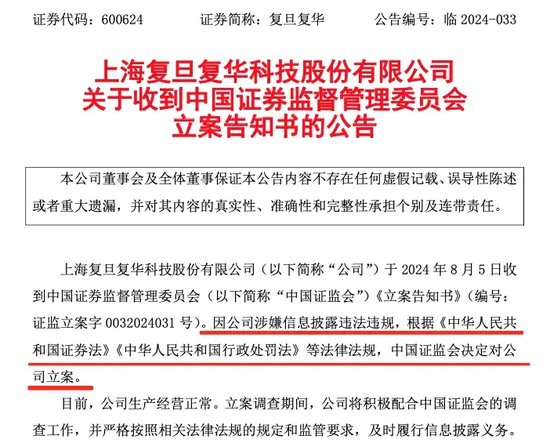 复旦复华(600624)8月5日晚间公告,公司8月5日收到中国证监会《立案告知书》。因公司涉嫌信息披露违法违规,中国证监会决定对公司立案。
