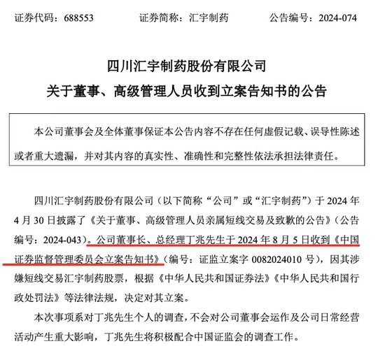 同日被立案调查的还有汇宇制药。8月5日晚间汇宇制药(688553)公告,公司董事长、总经理丁兆2024年8月5日收到《中国证券监督管理委员会立案告知书》,因其涉嫌短线交易汇宇制药股票,根据相关法律法规,决定对其立案。